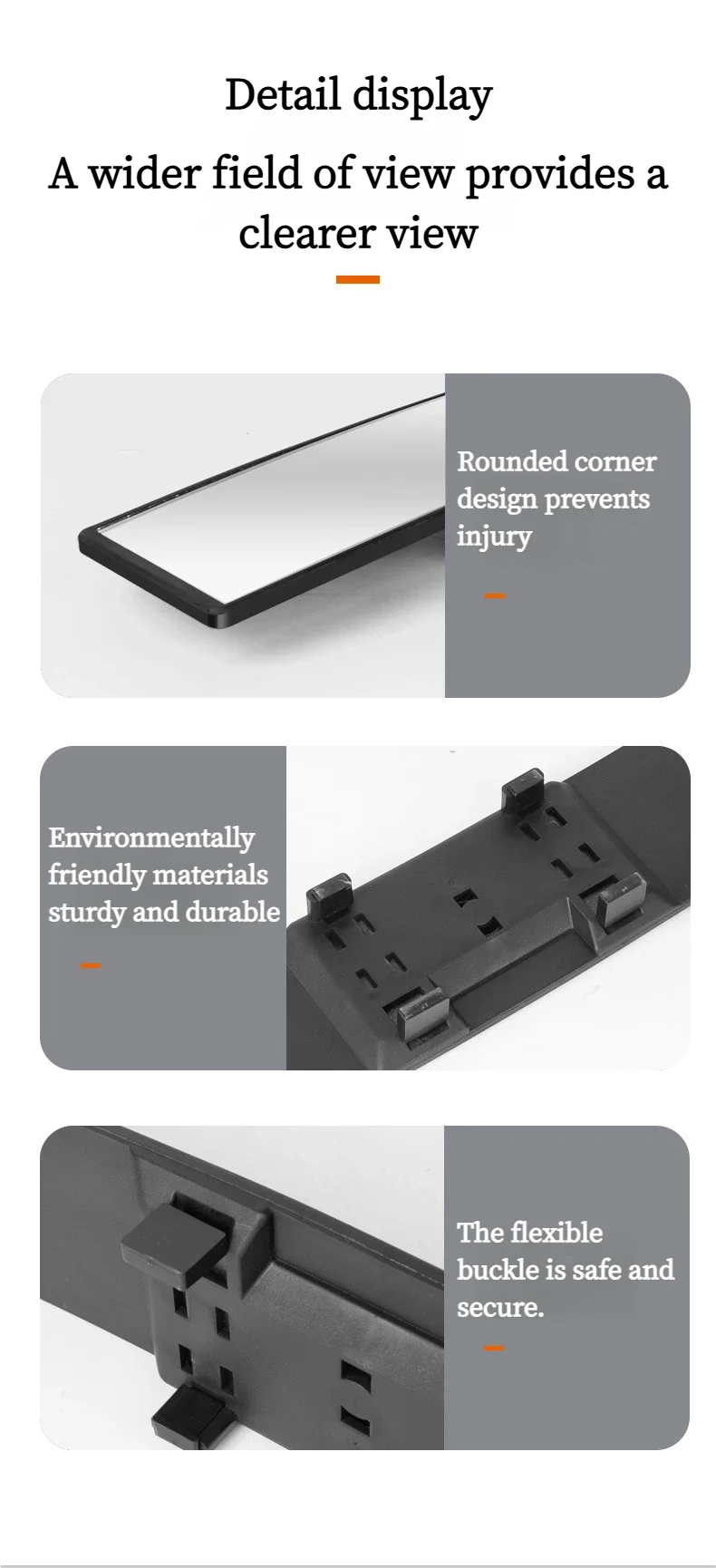 Improve your driving safety and rear visibility with this 12-inch Universal Convex Interior Rearview Mirror. The wide-angle panoramic design significantly expands your viewing range, helping reduce blind spots and increasing awareness of surrounding traffic.Constructed from durable ABS and high-quality glass, this mirror delivers both strength and clarity. The polished lens enhances reflection quality, while the anti-glare and anti-fog features ensure a clearer view in different lighting and weather conditions.The snap-on installation system allows quick and secure mounting over your existing mirror without causing damage. Rubberized clips help maintain stability by reducing vibrations and preventing image distortion.This interior rearview mirror is an ideal upgrade for drivers seeking enhanced visibility, improved safety, and effortless installation.
