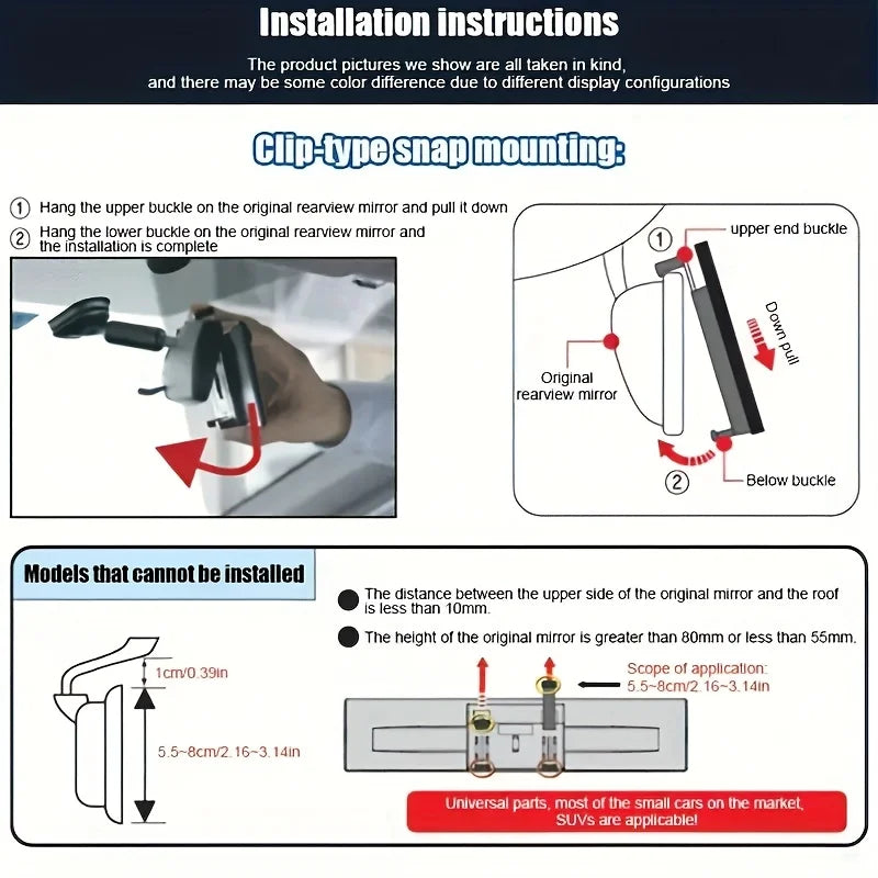 Installs directly over your existing rearview mirror using a snap-on design. No tools or professional installation required. The non-damaging structure preserves your original mirror.Universal Fit for Most Vehicles
